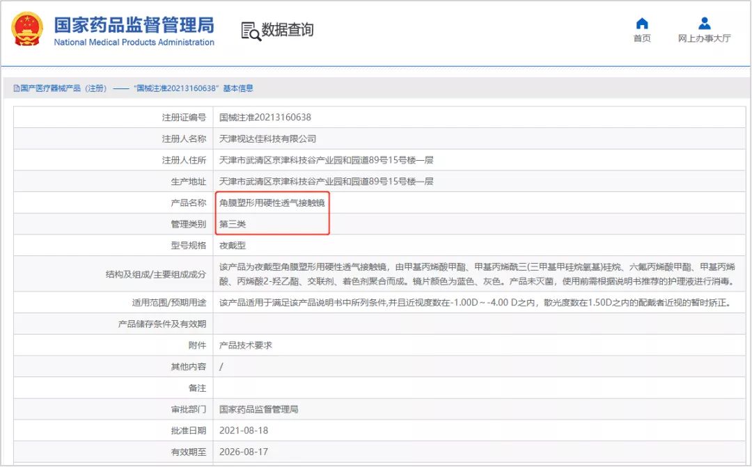 ——2021年8月18日,天津視達佳科技有限公司生產的產品“夜戴型角膜塑形用硬性透氣接觸鏡(ok鏡)”獲批國家藥監局三類醫療器械注冊證(國械注準20213160638),這也是國產的第三張角膜塑形鏡產品證書。