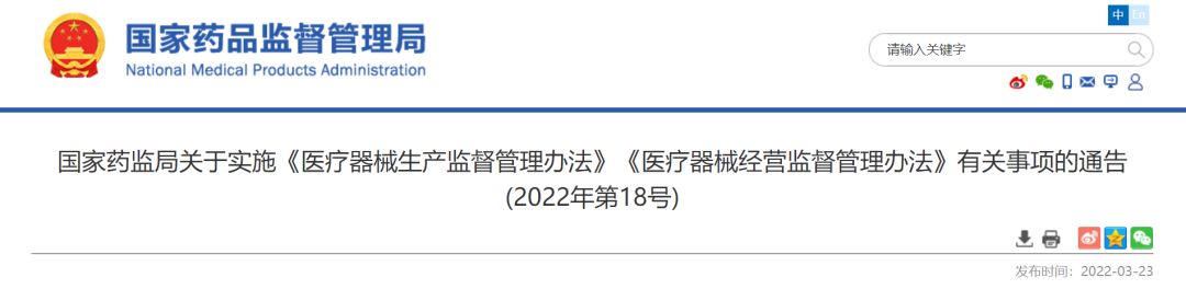 自2022年5月1日起,《食品藥品監管總局關于實施〈醫療器械生產監督管理辦法〉和〈醫療器械經營監督管理辦法〉有關事項的通知》(食藥監械監〔2014〕143號)予以廢止。