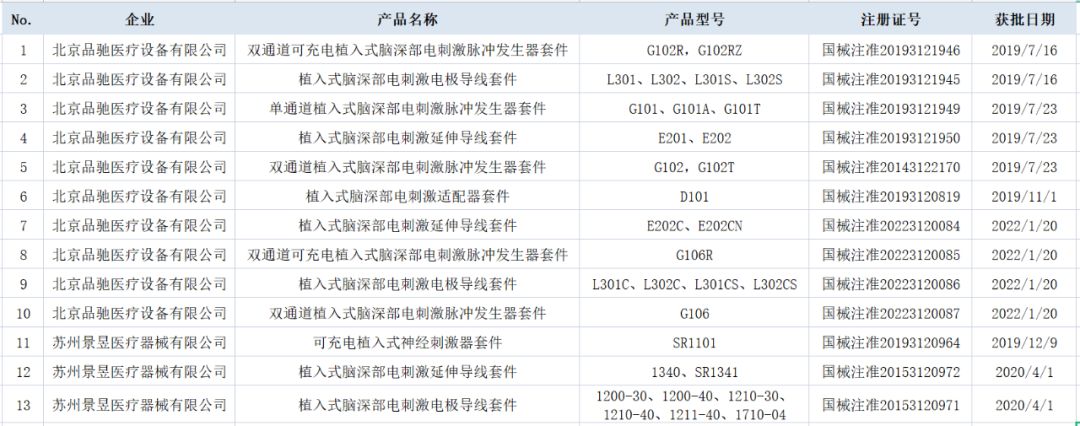 國內已獲證的用于帕金森的腦起搏器產品(來源:NMPA)