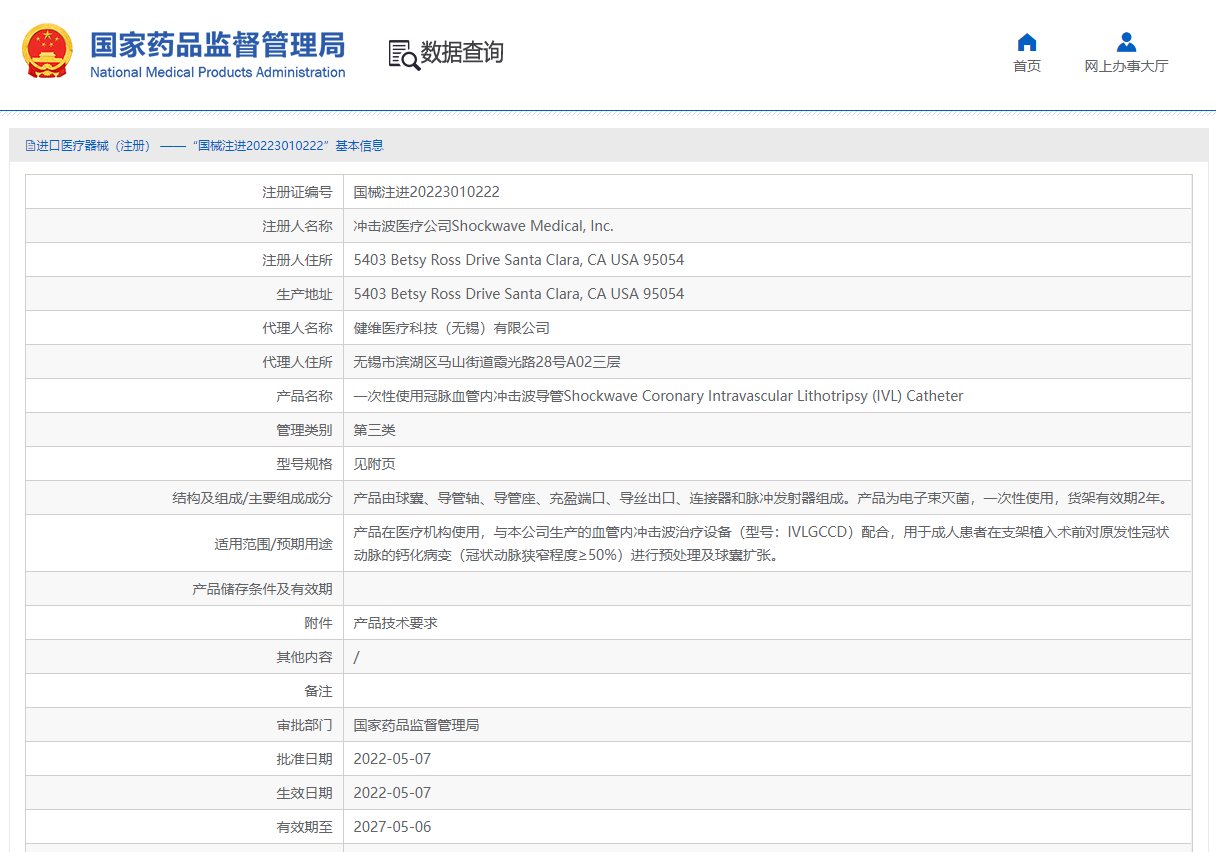 Shockwave冠脈血管內(nèi)沖擊波導(dǎo)管獲批信息