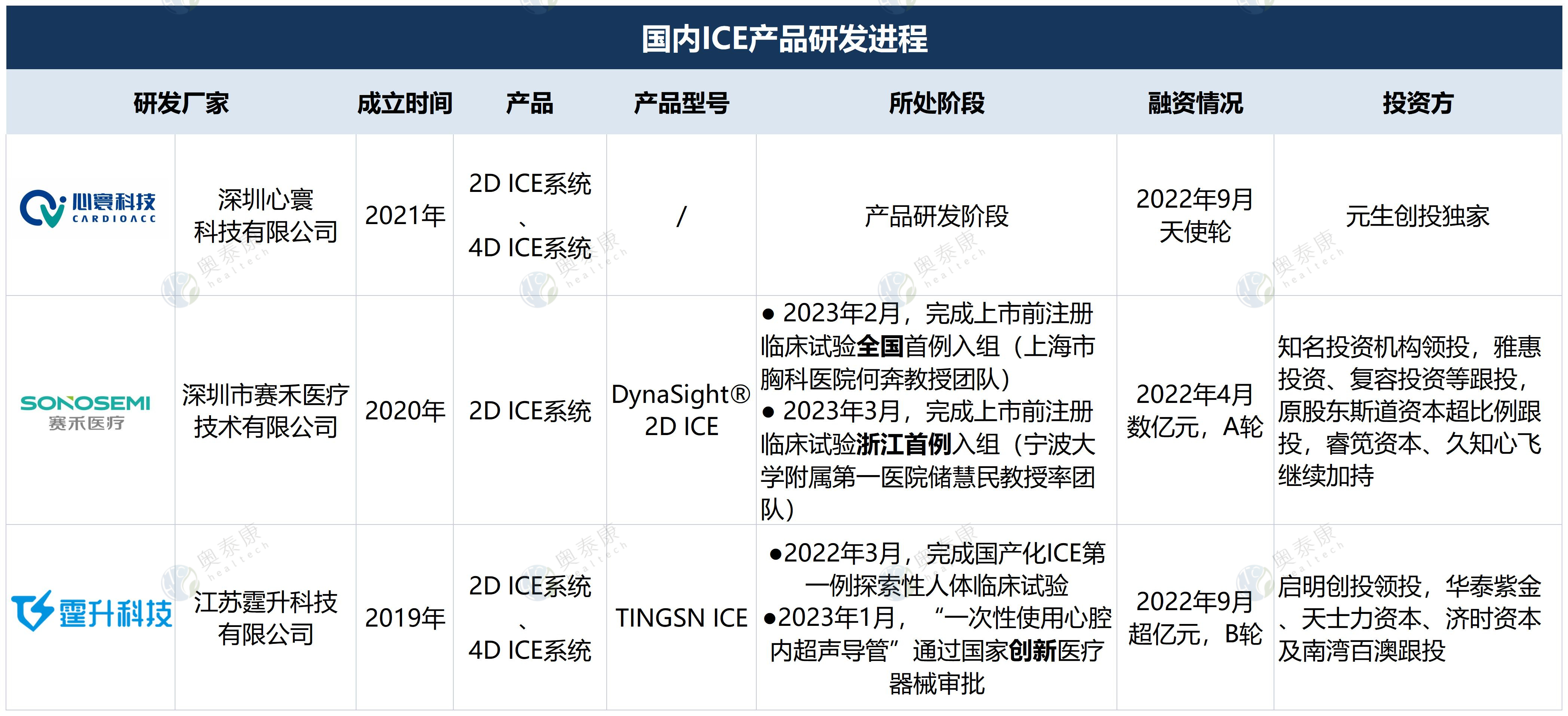 全球ICE市場中,歐美企業占主要份額,強生、雅培、西門子、飛利浦、GE醫療、波士頓科學等均已布局,而國內ICE起步較晚,仍處發展初期,相關產品和市場滲透率較低,企業具有較大的發展空間,國內研發廠商有塞禾醫療、心寰科技、霆升科技、澤樸醫療、歡影醫療等。隨著ICE在臨床應用優勢的凸顯,ICE賽道逐漸升溫并獲得資本青睞,國內部分ICE廠家已在2022年完成新一輪融資。