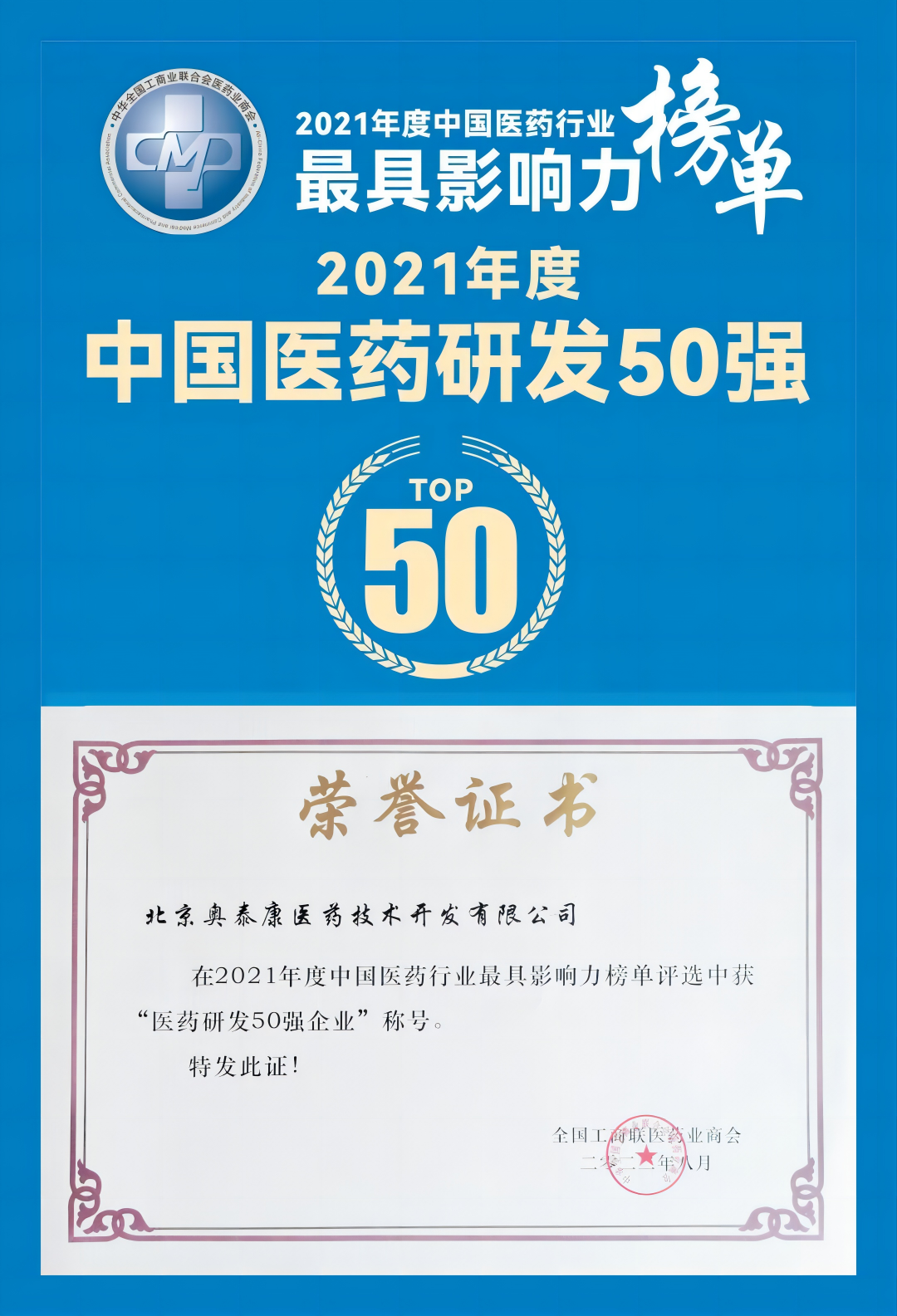 捷報 「2023.3.25·青島」?? 全國工商聯醫藥業商會年度峰會 —中國醫藥行業最具影響力榜單 奧泰康入圍中國醫藥研發50強