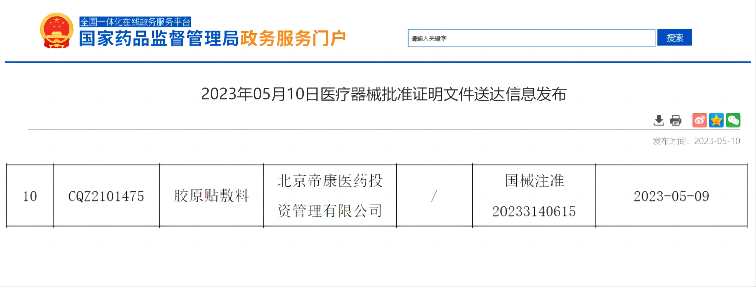MA成果發布_2023年5月9日,奧泰康北京CDMO中心取得「首張」國家藥監局批準的三類醫療器械注冊證2023年5月9日,奧泰康北京CDMO中心取得「首張」國家藥監局批準的三類醫療器械注冊證(國械注準20233140615),系全國首個以細胞外基質來源的膠原蛋白為原料制備的三類膠原貼敷料。此項目是北京CDMO中心基于“十三五”國家重點研發計劃項目,在MAH制度下,與湖北恒安芙林藥業股份有限公司戰略合作完成涵蓋市場準入全流程業務的醫美類項目,也是器械CRO/CDMO行業受托研發誕生的全國首個三類醫療器械注冊證,具有里程碑意義。