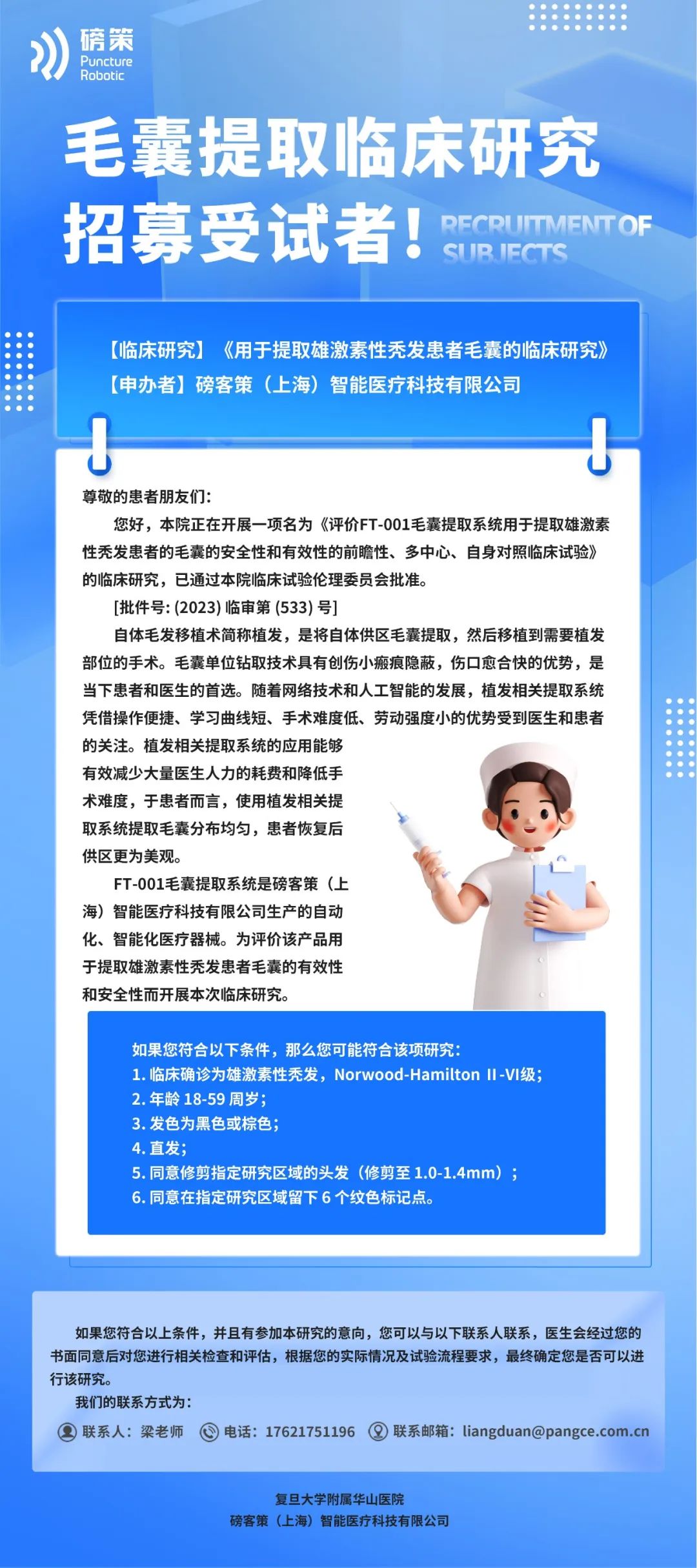 近期,由磅客策 (上海)智能醫療科技有限公司研發的磅策植發機器人在上海成功召開臨床試驗啟動會暨人工智能毛發創新中心落成典禮,奧泰康負責臨床試驗服務。