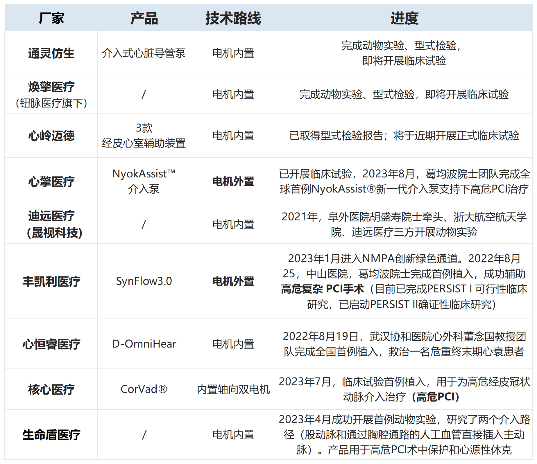 介入式人工心臟是高技術(shù)、高門檻賽道,國內(nèi)有少數(shù)創(chuàng)新企業(yè)布局。其中,心恒睿醫(yī)療、核心醫(yī)療、通靈仿生、心嶺邁德、晟視科技、心擎醫(yī)療、豐凱利醫(yī)療等企業(yè)不僅在資本寒冬期逆勢(shì)完成融資,且相關(guān)產(chǎn)品推進(jìn)順利,進(jìn)展極快。