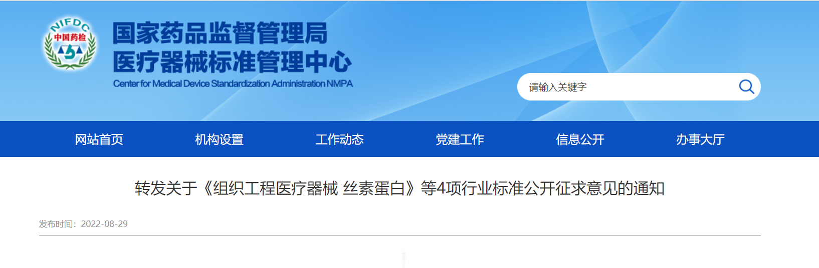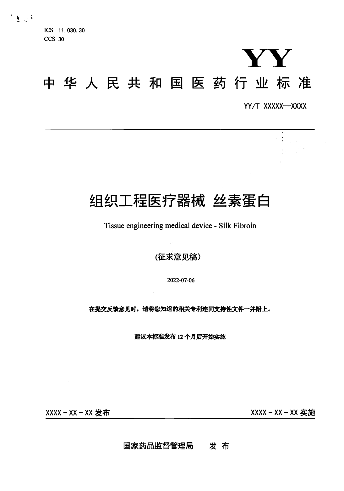 隨著絲素蛋白醫(yī)療器械產(chǎn)品的增加,對這一材料的生產(chǎn)制備、質(zhì)量控制等提出了要求。相對于產(chǎn)業(yè)的迅速發(fā)展,絲素蛋白相關(guān)標準在國際國內(nèi)仍處于空白。由于標準的缺乏,各絲素蛋白企業(yè)在企業(yè)標準制定過程中無統(tǒng)一的標準參考依據(jù),限制了絲素蛋白醫(yī)療產(chǎn)業(yè)的高質(zhì)量發(fā)展。目前,為提高絲素蛋白材料的質(zhì)量與安全性,為科學(xué)監(jiān)管提供支撐,由全國外科植入物和矯形器械標準化技術(shù)委員會組織工程醫(yī)療器械產(chǎn)品分技術(shù)委員會歸口的《組織工程醫(yī)療器械絲素蛋白》已形成征求意見稿[5],并于2022年8月23日-2022年10月24日期間公開征求意見。