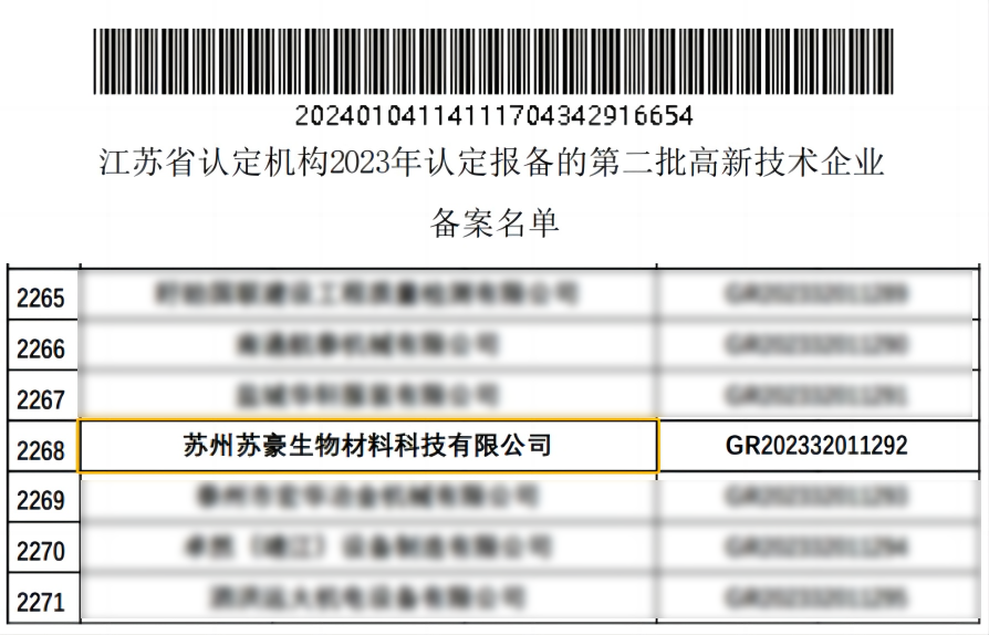 根據《高新技術企業認定管理辦法》和《高新技術企業認定管理工作指引》有關規定,全國高新技術企業認定管理工作領導小組辦公室公告了江蘇省認定機構2023年認定報備的第二批高新技術企業名單,奧泰康蘇州CDMO中心——蘇州蘇豪生物材料科技有限公司榮列其中,獲得江蘇省高新技術企業認定,這是奧泰康企業發展歷程中的重要里程碑。