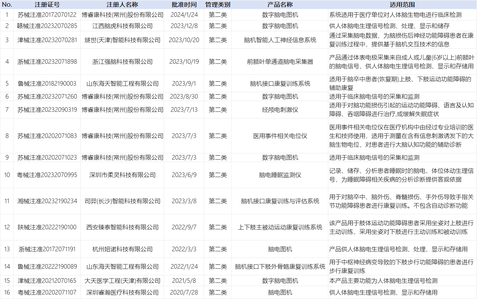 我國已獲批的二類腦機接口產品