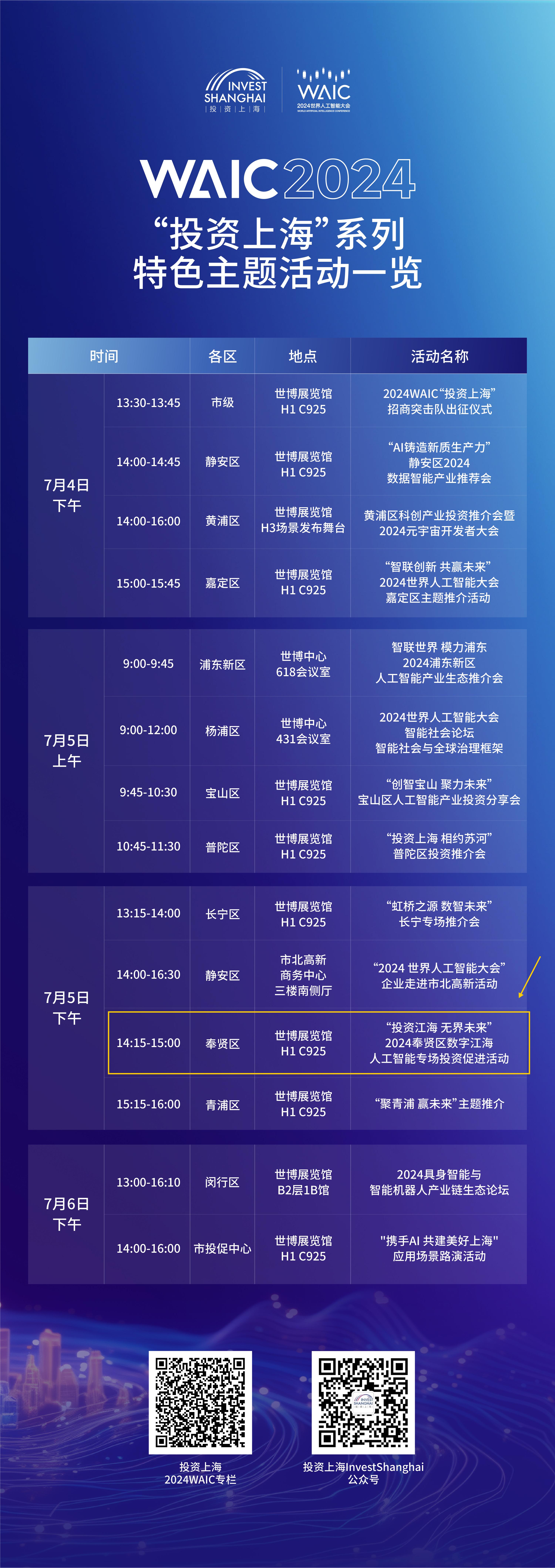 WAIC 2024是人工智能行業的世界盛會,為把握大會激發的全新投資機遇,推動展商變投資商,市投促中心聯合各區投促部門,將在大會期間舉辦一系列精彩紛呈的特色主題活動,向世界分享上海AI產業投資機遇。奧泰康受邀參加【“投資上海”系列特色主題活動】,并在“投資江海 無界未來”2024奉賢區數字江海人工智能專場投資促進活動專場圍繞腦機接口領域展開主題分享,屆時將與醫療行業同仁共同交流,期待各位蒞臨現場。