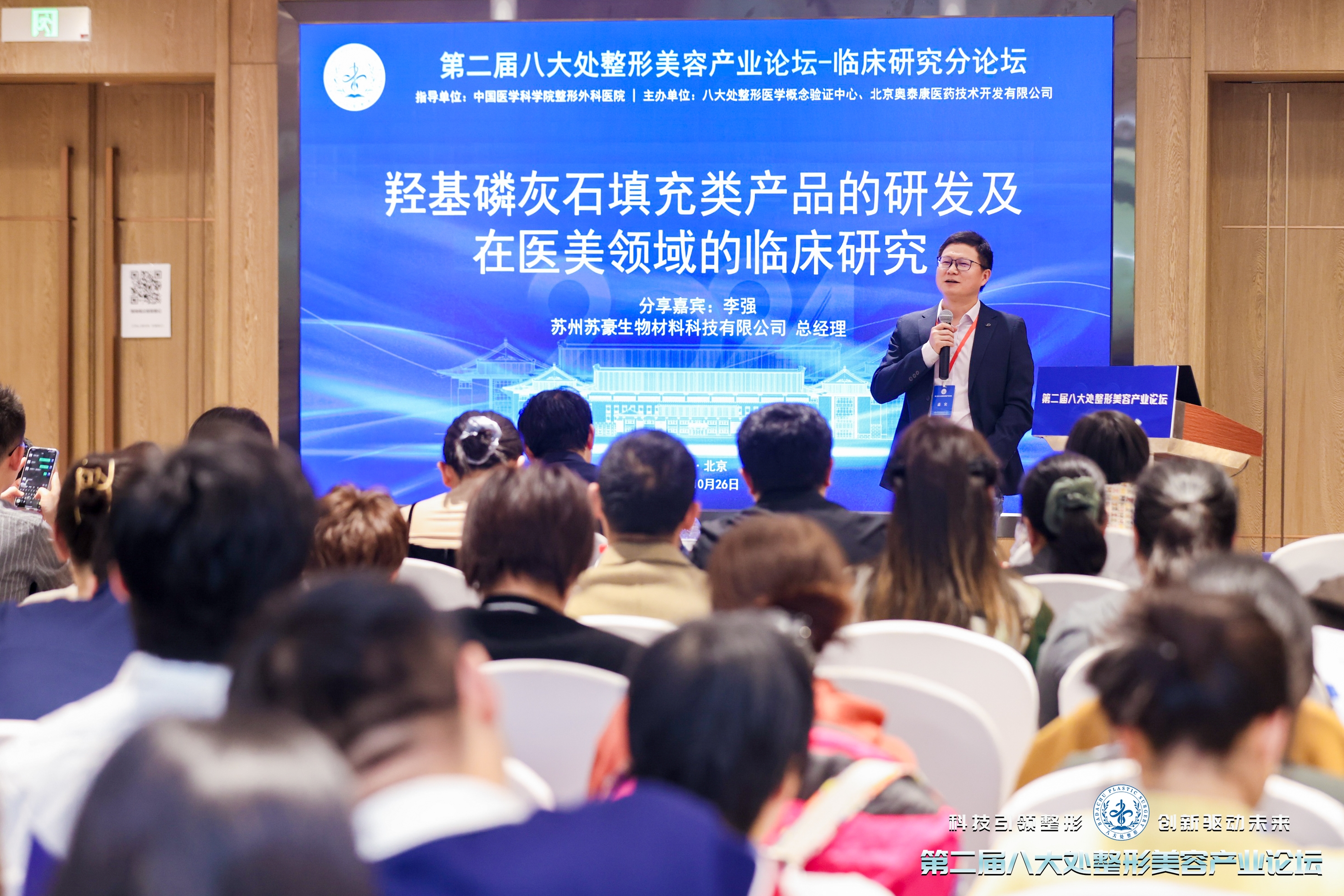 蘇州蘇豪生物材料科技有限公司總經理李強通過《羥基磷灰石填充類產品的研發及在醫美領域的臨床研究》講述了羥基磷灰石的材料特性、工藝制備等,結合實際案例,闡述了羥基磷灰石的在醫美填充中的臨床應用及未來發展方向,為行業提供了實際操作上的指導。