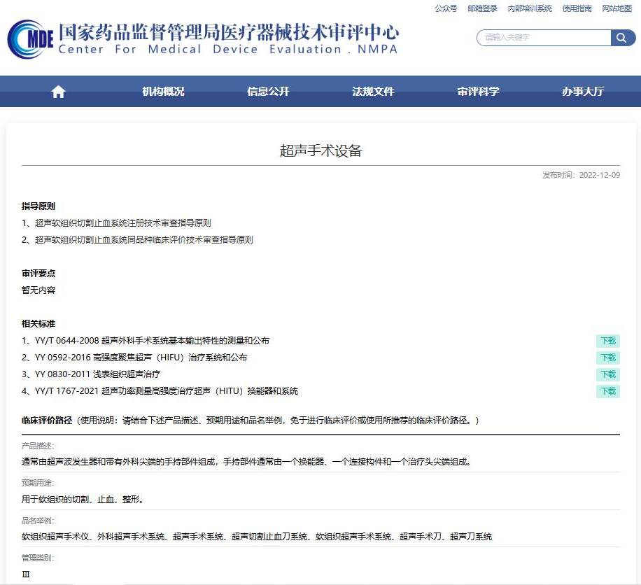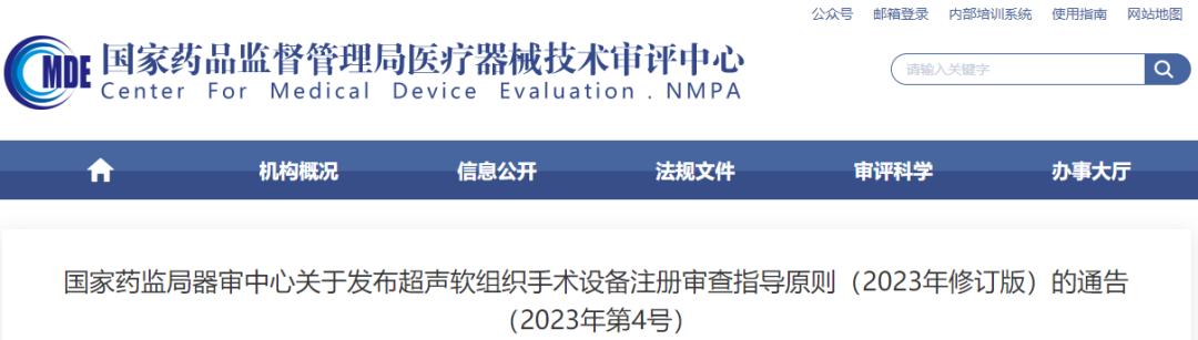 ●2023年3月31日,國家藥監局器審中心修訂發布了《超聲軟組織手術設備注冊審查指導原則》(2023年修訂版)。(附件:超聲軟組織手術設備注冊審查指導原則(2023年修訂版)