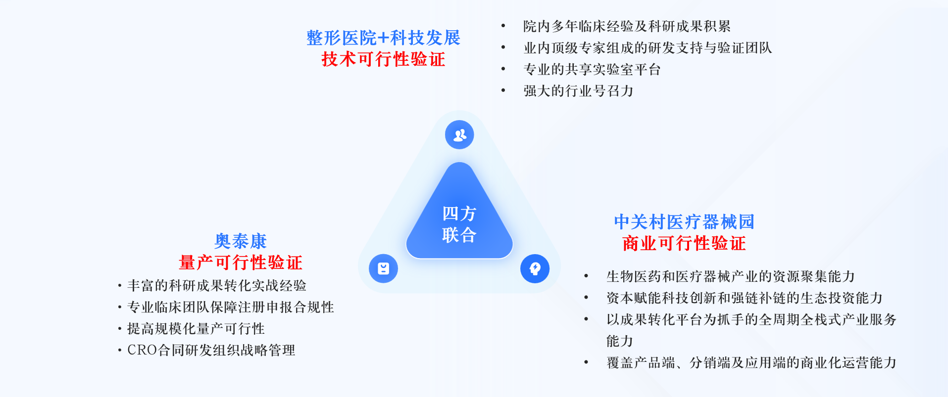北京市整形醫(yī)學(xué)概念驗(yàn)證中心項(xiàng)目,由四家單位聯(lián)合申報(bào)實(shí)施。其中北京八大處整形科技發(fā)展有限公司聯(lián)合中國(guó)醫(yī)科院整形外科醫(yī)院完成技術(shù)可行性驗(yàn)證,北京奧泰康醫(yī)藥技術(shù)開發(fā)有限公司負(fù)責(zé)量產(chǎn)化驗(yàn)證,中關(guān)村醫(yī)療器械園有限公司完成商業(yè)化驗(yàn)證,四方相互協(xié)同,構(gòu)建“醫(yī)研產(chǎn)銷”一體化生態(tài)。